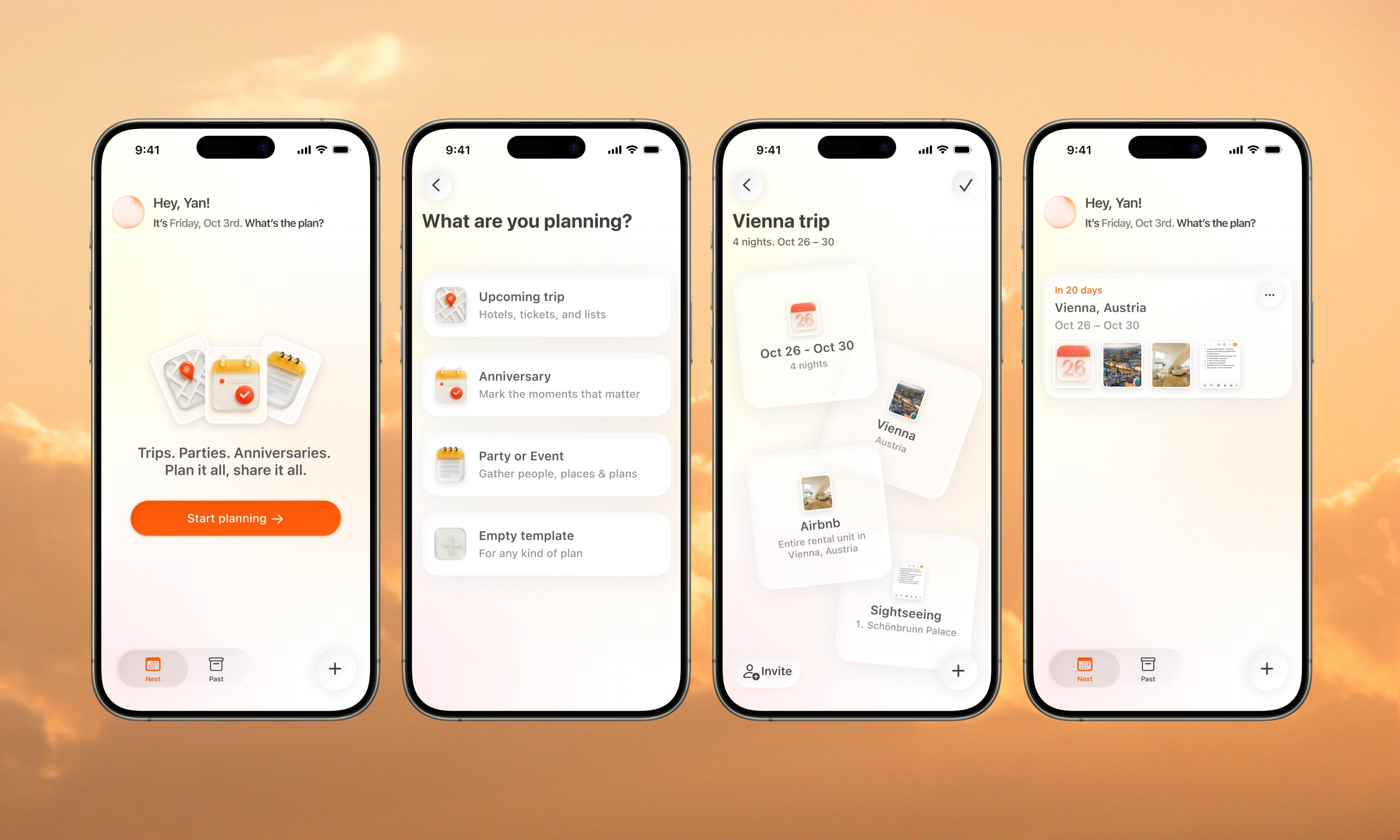 The flow takes users from picking what they’re planning – a trip, party, or anniversary – to adding key details like dates, places, and notes.