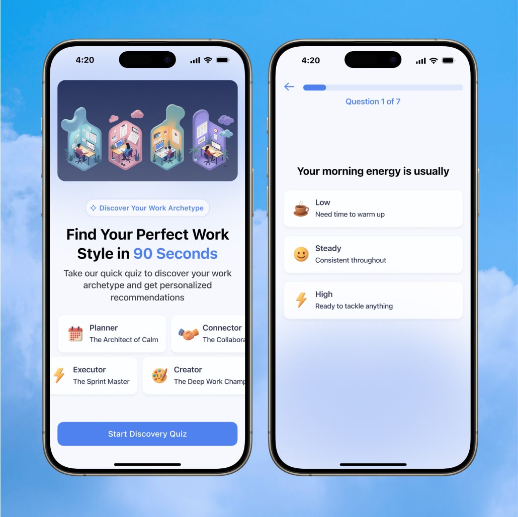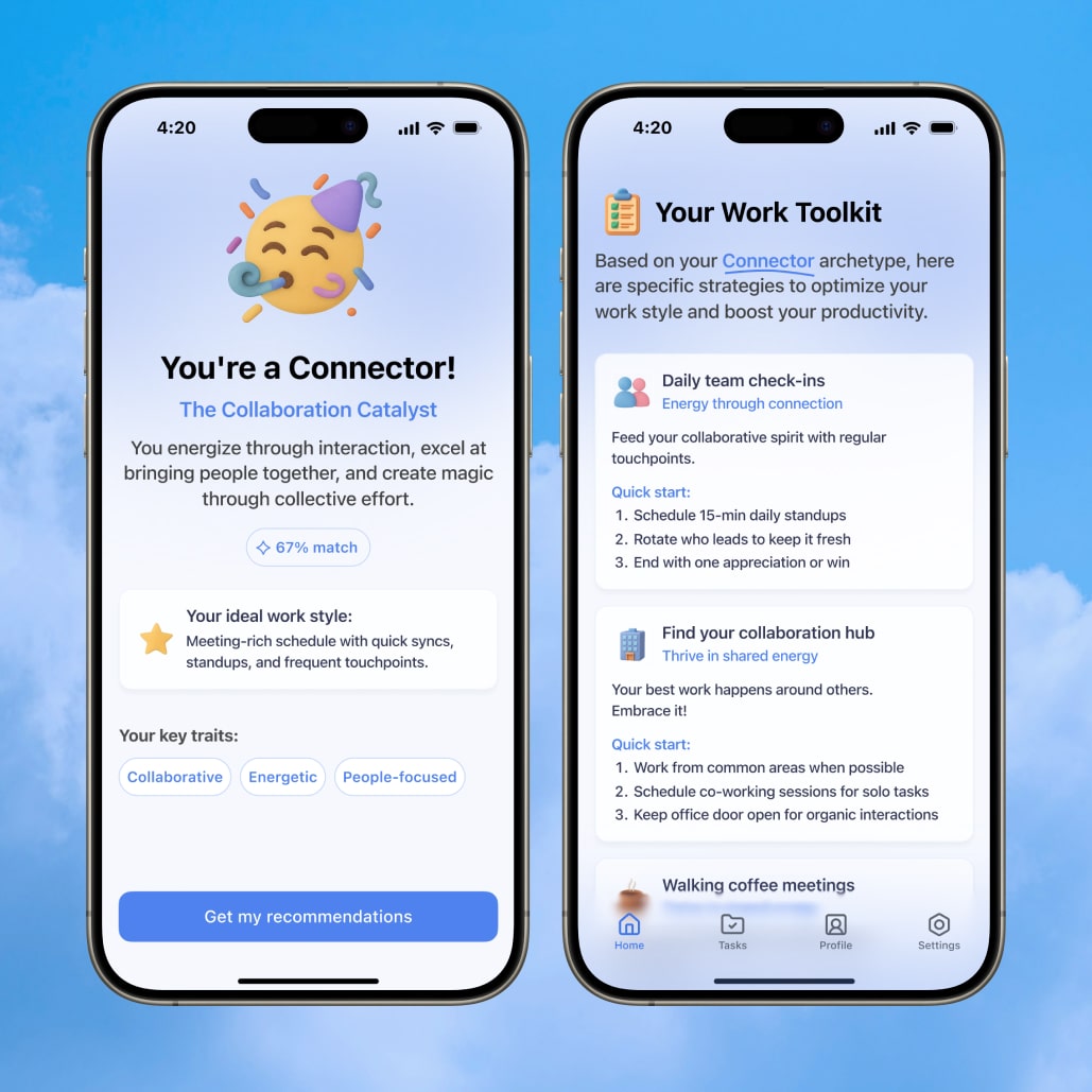 As the founding designer, I created the full 0 → 1 experience. From the discovery quiz and work-style archetypes to dashboards and team insights – turning abstract traits into playful, actionable improvements.